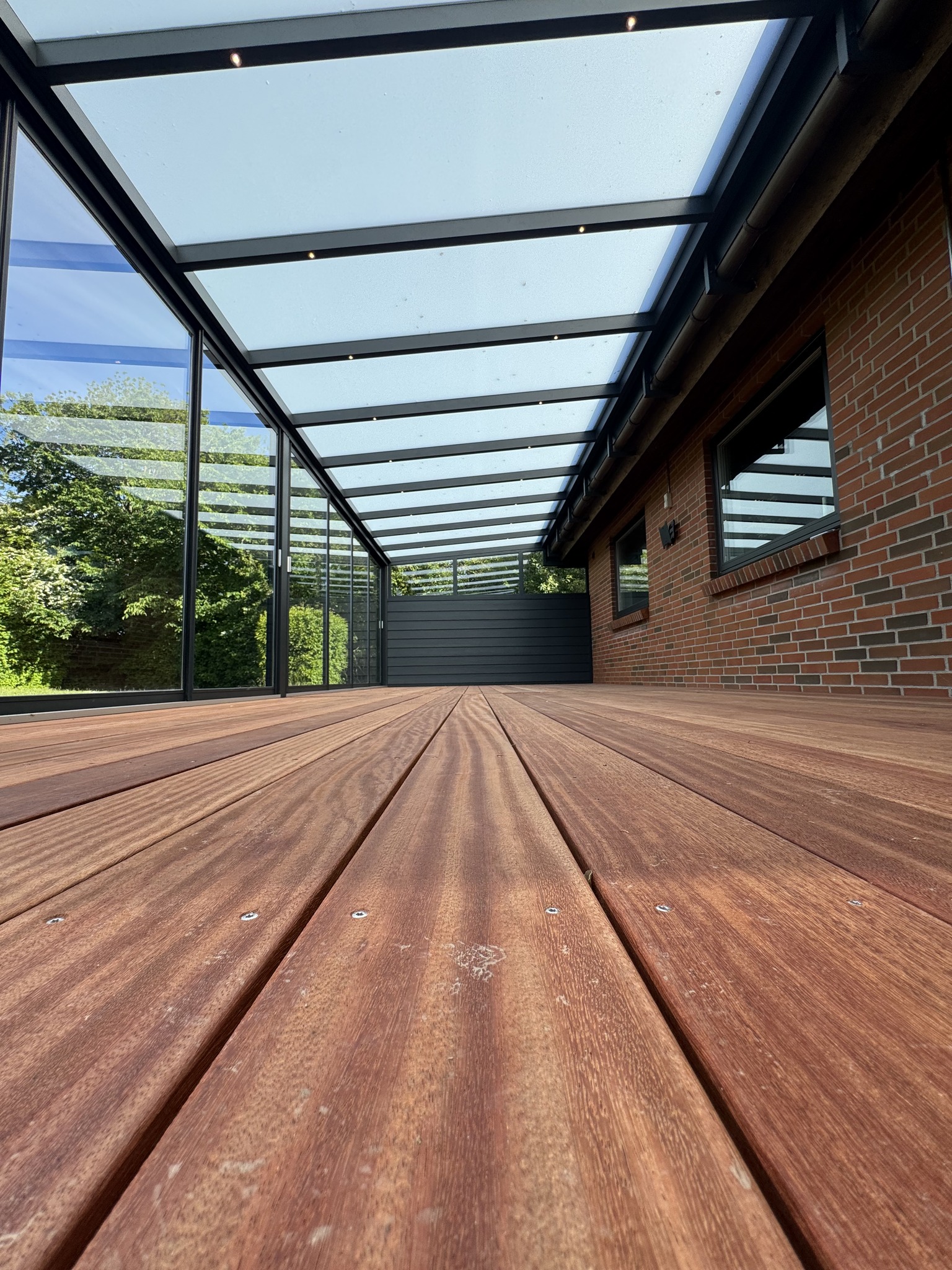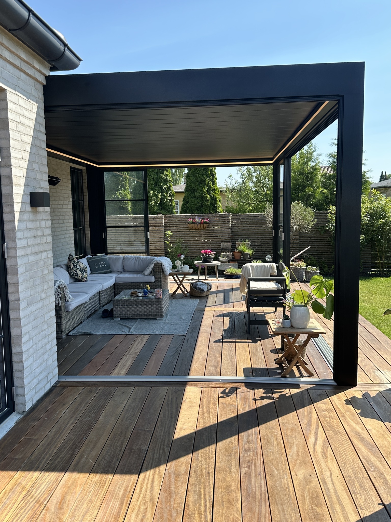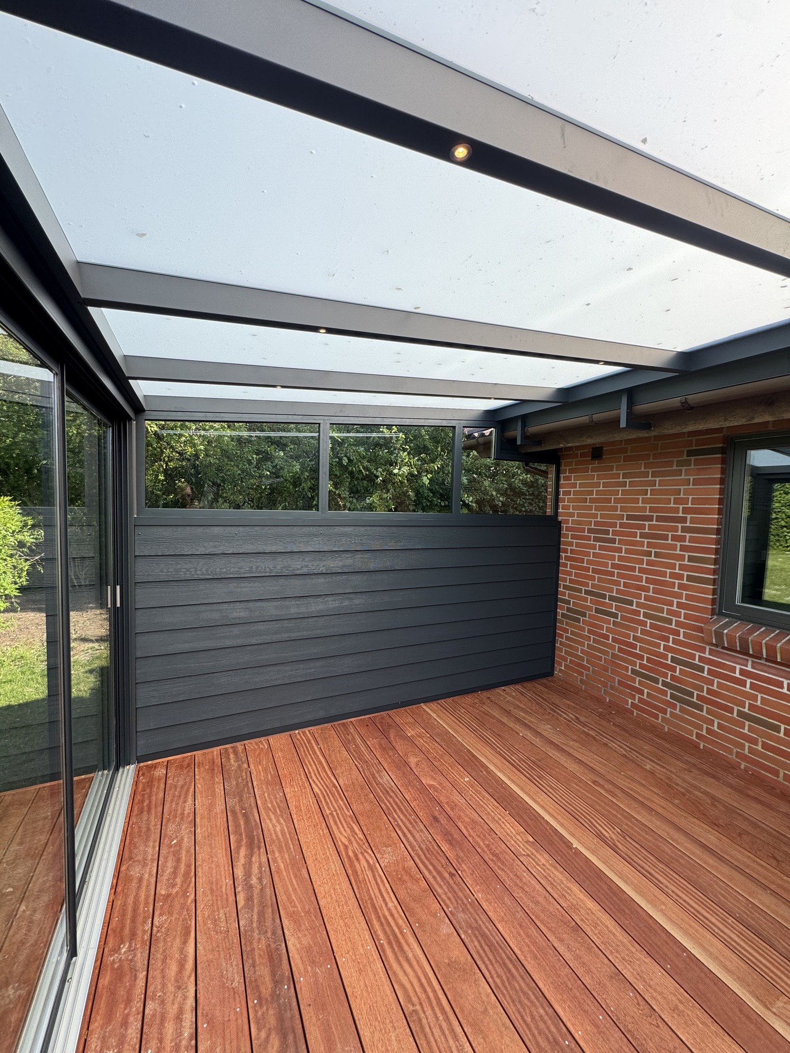 I den ene ende har vi bygget en fastvæg i HardiePlank, som skaber læ og fungerer som et solidt supplement til skydedørene.