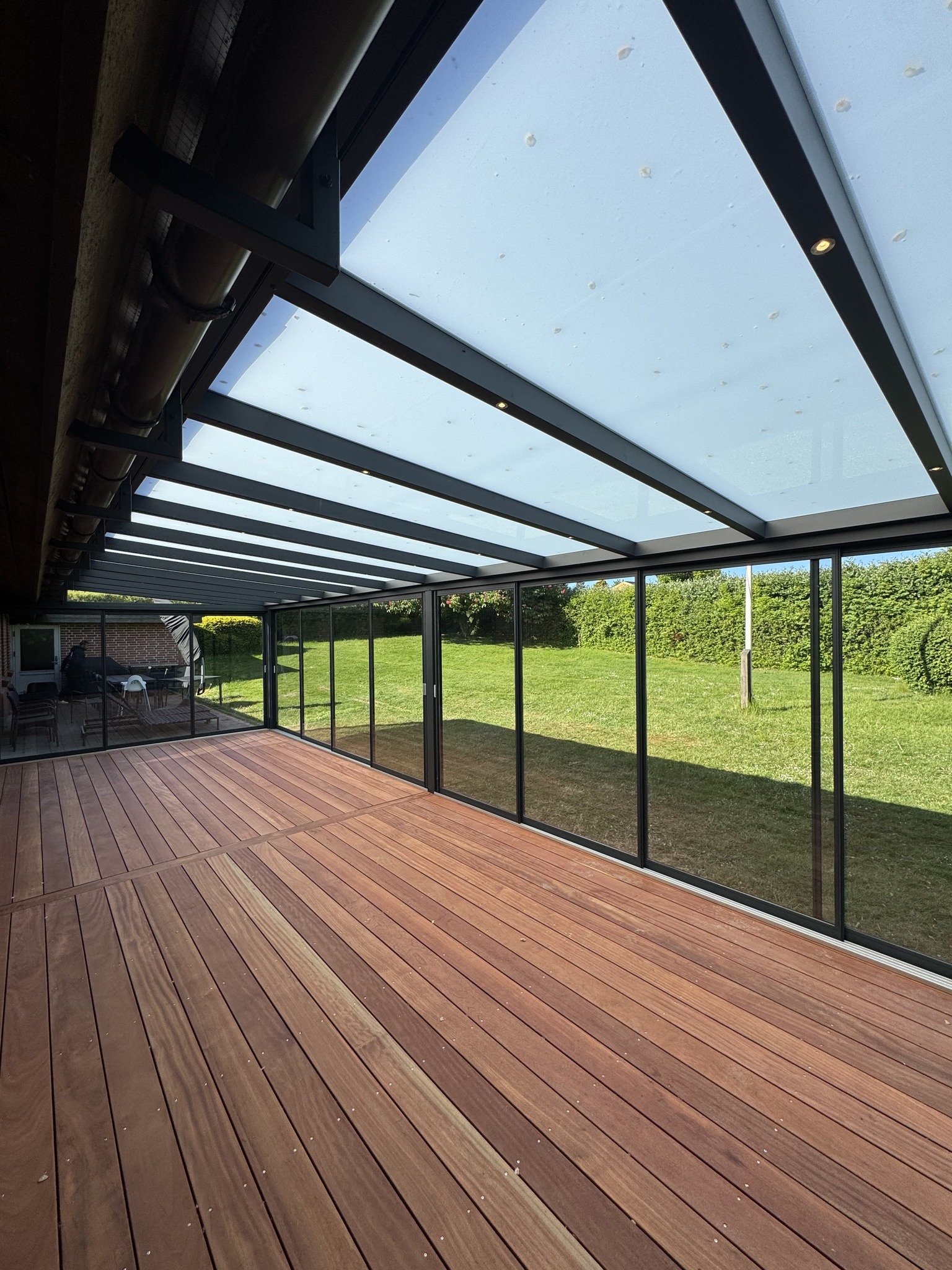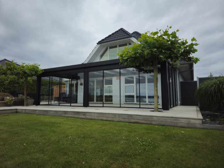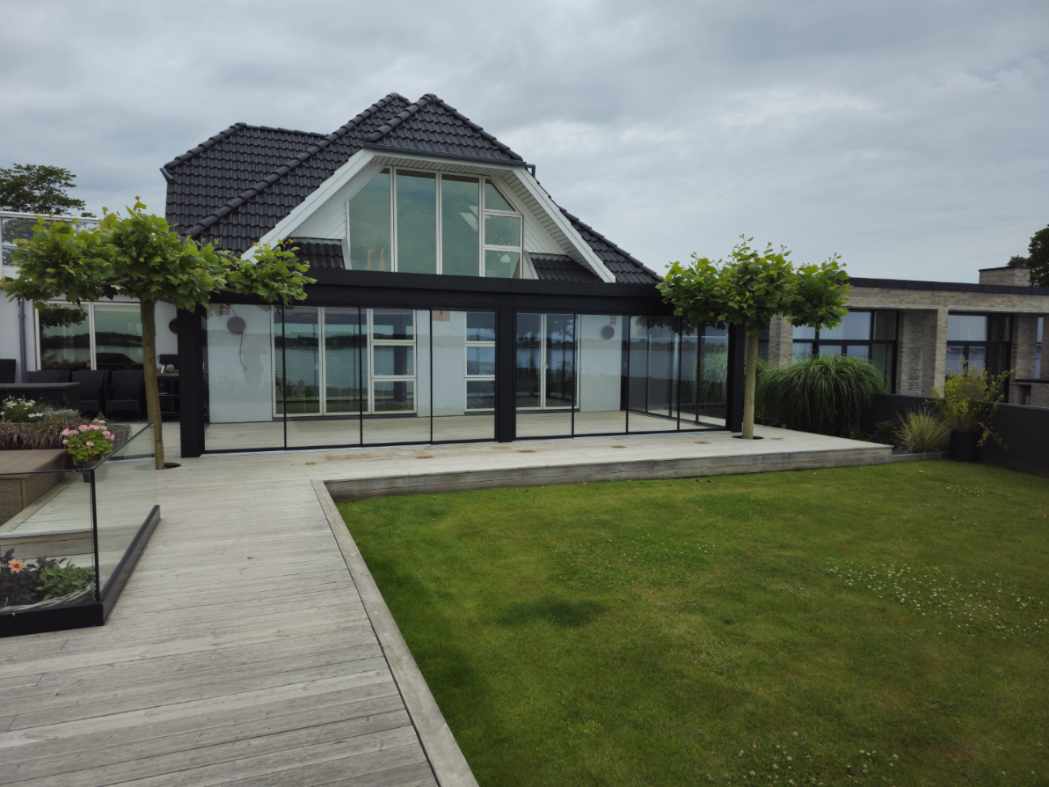 Kunden ønskede en lidt speciel tagløsning med specielt skåret tagglas. Det er vores populære overdækning med termoglas i tag, og 22 mm fast termoglas i siden der er delt med en midter sprosse. I fronten har vi monteret vores elektriske hæve sænke glas i 22 mm termoglas der ligeledes er delt med midtersprosse.