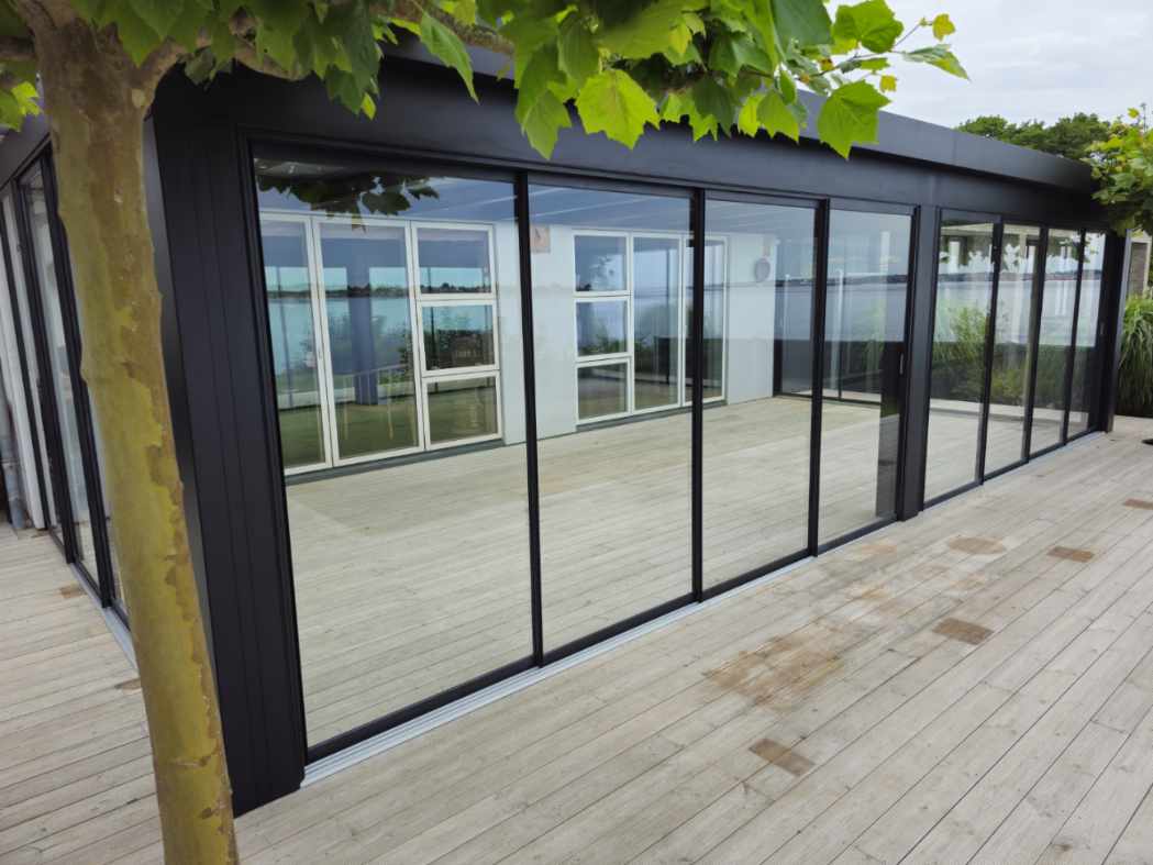 Kunder ønskede at lukke deres overdækkede terrasser med skydedøre for bedre læ, fleksibilitet og udnyttelse af rummet.